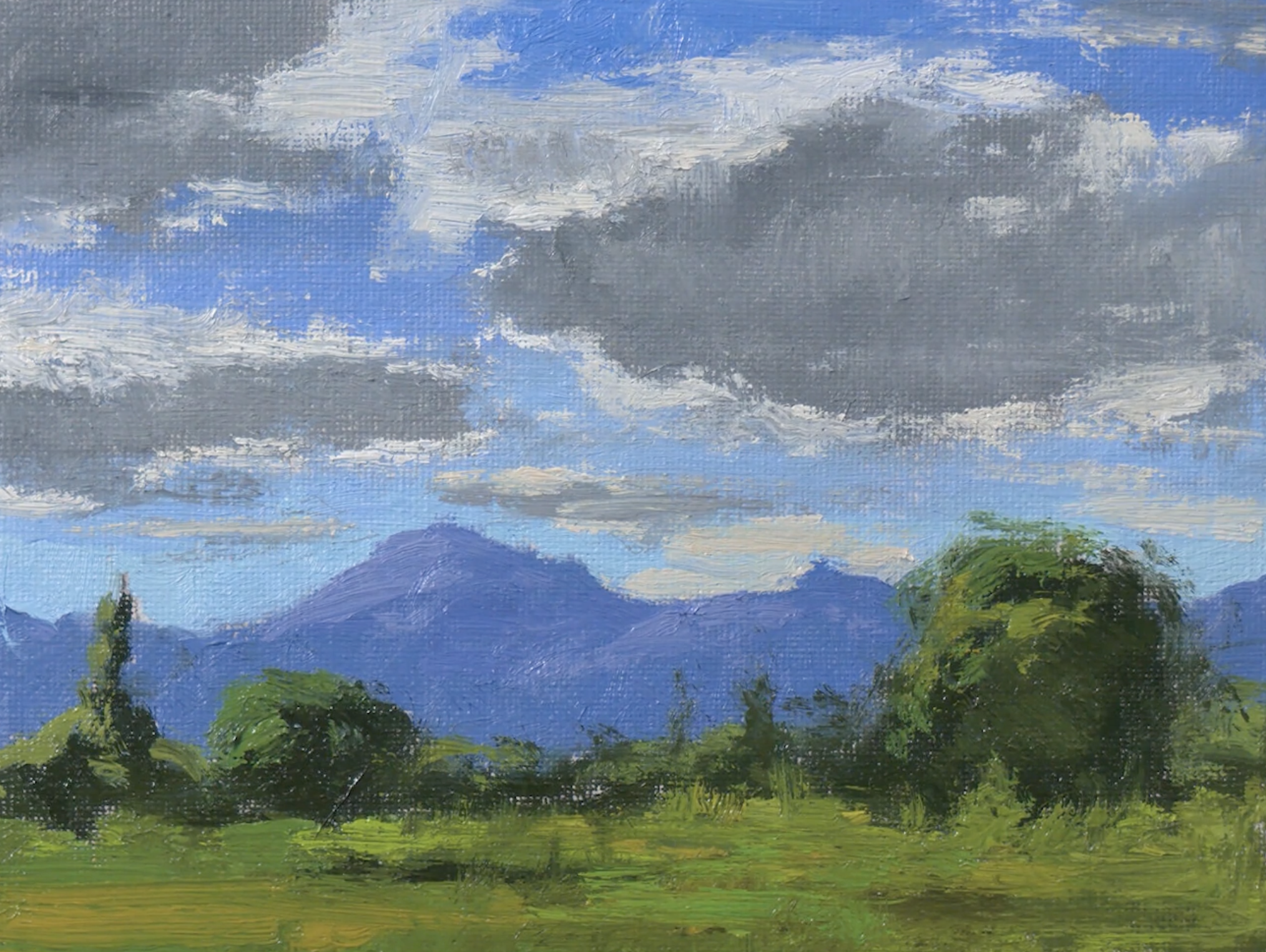 Warm afternoon. Big, generous clouds stacked up against the blue. This is the painting where you learn to see the architecture in the sky — one dominant shape that holds everything together, and smaller shapes that play against it.